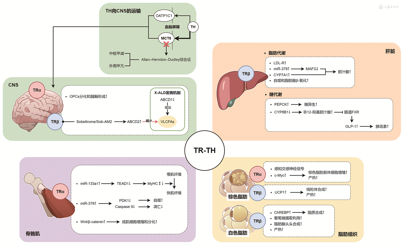 注:TR为甲状腺激素受体;TH为甲状腺激素;CNS为中枢神经系统;OATP1C1为有机阴离子转运蛋白1C1;MCT8为单羧酸转运体8;Allan-Herndon-Dudley综合征为MCT8基因突变导致的一种临床表现为中枢甲状腺功能减退和外周甲状腺毒症的遗传综合征;TRα为甲状腺激素受体α;TRβ为甲状腺激素受体β;OPCs为少突胶质细胞前体细胞;X-ALD为X连锁的肾上腺脑白质营养不良;ABCD为极长链脂酰辅酶A跨膜转运蛋白;VLCFAs为极长链脂肪酸;miR-133a1为微小RNA-133a1;TEAD1为TEA域家族成员1;MyHC Ⅰ为Ⅰ型肌球蛋白重链;miR-378为微小RNA-378;PDK1为磷酸肌醇依赖性蛋白激酶1;Caspase 9为半胱氨酸天冬氨酸蛋白酶9;LDL-R为低密度脂蛋白受体;MAFG为小Maf转录因子G:CYP7A1为胆固醇7α-羟化酶;PEPCK为磷酸烯醇式丙酮酸羧化激酶;CYP8B1为胆固醇12α-羟化酶;FXR为法尼醇X受体;GLP-1为胰高血糖素样肽-1;UCP1为1型解偶联蛋白;ChREBP为碳水化合物反应元件结合蛋白