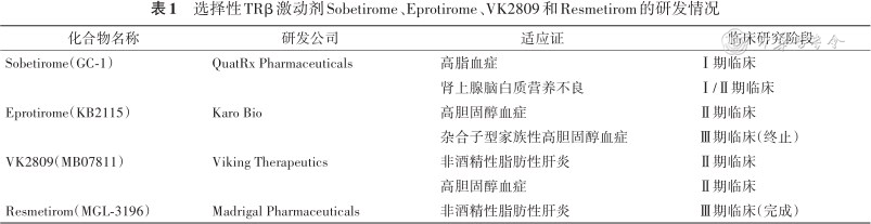 数十年前,基于对甲状腺功能异常患者血脂变化的临床观察,研究者们产生了运用TH及其类似物治疗高胆固醇血症的设想。1957年Galioni等[31]发现使用甲状腺冻干粉可以降低人体血浆低密度脂蛋白胆固醇(LDL-C)水平,提示TH可能具有治疗血脂升高的潜力。但是非选择性TH类似物可激动肝外TR,引起心脏毒性、肌肉和骨质丢失等不良反应。因此,如何实现靶器官的选择性成为了深入研究的方向。20世纪80年代,L-94901等一批肝脏选择性TH类似物展现出降低啮齿动物血清胆固醇水平的疗效,且不伴心脏毒性[32]。在发现TR亚型后,主要存在于肝脏并介导脂质代谢的TRβ成为了药物研发的新靶点。