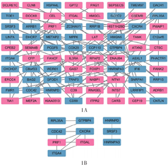 注:GEO为基因表达综合;AML为急性髓系白血病;DEG为差异表达基因;PPI为蛋白相互作用;图1A中为具有潜在交互作用的共同DEG,剔除了边缘DEG;粉色节点表示上调基因,蓝色节点表示下调基因