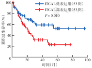 将10个关键基因上传到GEPIA2网站,其中6个基因(ITGA4、ITGAL、HNRNPA3、GTPBP4、CXCR4、RPL35A)通过GEPIA分析得到再次确认,ITGA4、ITGAL、CXCR4在AML样本中表达明显高于正常样本,HNRNPA3、GTPBP4、RPL35A表达明显低于正常样本,差异均有统计学意义(均P<0.05)(图2)。通过Kaplan-Meier生存曲线分析显示,与ITGAL低表达的AML患者相比,ITGAL高表达的患者总生存不佳,差异有统计学意义(P=0.010)(图3);其余9个关键基因高表达与低表达患者间总生存差异均无统计学意义(均P>0.05)。