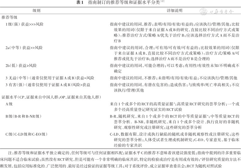 指南制订的推荐等级和证据水平分类[12]