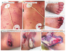 患儿,女,1岁4个月,因"皮疹4 d,发热2 d,嗜睡1 d"于2023年12月5日入院。入院前4 d患儿自额头开始出现散发透明疱疹,渐蔓延至躯干、四肢和会阴。次日疱疹周围皮肤呈弥漫深红。入院前2 d,患儿出现发热,体温最高39.0 ℃,口服布洛芬等仍发热。入院前1 d,患儿出现嗜睡。外院查C-反应蛋白(C-reactive protein,CRP) 91.5 mg/L,予头孢曲松等治疗未见明显效果,意识障碍进一步加重。入院前4 h,患儿对外界刺激无反应,呕吐2~3次胃内容物,遂收入儿童重症监护室(Pediatric Intensive Care Unit,PICU)。患儿既往体健,出疹前接触过患水痘的哥哥,未接种过水痘疫苗。入院查体:体温37.0 ℃、心率190次/min、呼吸50次/min、血压87/52 mmHg(1 mmHg=0.133 kPa)。急性病容,神志恍惚。咽充血,弱三凹征,双肺未闻及啰音。全身散在分布紫红色皮疹,部分瘀斑,额部疱疹已结痂,部分结痂处有黄色脓性分泌物;躯干可见结痂皮疹,躯干及肢端弥漫性细小紫红色丘疹,部分呈紫红色斑疹;左下肢腹股沟区下方见紫色皮损区,中央4.0 cm×1.5 cm表皮脱失,大部分外观呈紫黑色并有渗液,小部分表面呈白色(图1)。手足冰凉,血块收缩试验(clot retraction test,CRT)>5 s。实验室检查显示白细胞1.24×109/L,血红蛋白111 g/L,血小板55×109/L,CRP 118.04 mg/L,降钙素原(procalcitonin,PCT)>100.00 μg/L,凝血酶原时间29.20 s,活化部分凝血酶时间99.20 s,活化部分凝血活酶比率2.92,D-二聚体>20 mg/L,纤维蛋白(原)降解产物>150 mg/L,丙氨酸转氨酶48 U/L,天冬氨酸转氨酶212 U/L,总蛋白35 g/L,白蛋白23 g/L,球蛋白12 g/L,钠129.3 mmol/L,二氧化碳13.2 mmol/L,钙1.64 mmol/L,尿素氮14.72 mmol/L,肌酐106.7 μmol/L,尿酸1 223 μmol/L,β2微球蛋白12.64 mg/L,胱抑素C 2.71 mg/L,肌酸激酶-MB亚型44.7 U/L,乳酸脱氢酶1 040 U/L。脑脊液分析不支持中枢感染。血栓弹力图提示机体处于低凝状态,为弥漫性血管内凝血(disseminated intravascular coagulation,DIC)出血期。留取患儿双侧股静脉双瓶血培养,同时收集左腹股沟下方病变分泌物送细菌培养。