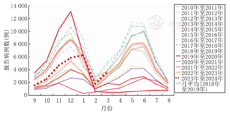 注:以每年9月至次年8月为一个监测年度。COVID-19疫情前(2010年至2019年)的各个监测年度的病例数曲线均以不同虚线显示,粉红粗线为疫情前9个监测年度(2010年9月至2019年8月)的月平均变化曲线;疫情后的4个整监测年度用不同颜色实线显示;2023年至2024监测年度以鲜红色点状曲线显示前7个月的数据 Each September to August period is a monitoring year.Pre-COVID(2010-2019) case curves are in various dashed lines,with a thick pink line for the pre-pandemic average(September,2010 August,2019).Post-outbreak years are in solid color lines of different shades;the 2023-2024 year is shown with a bright red dotted line for the first seven months′ data