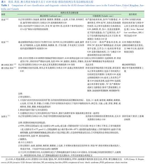 美国、英国、澳大利亚和加拿大关于iGAS疾病/感染的病例分类及诊断标准比较