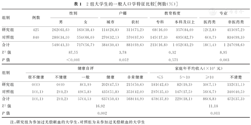 注:研究组为参加过无偿献血的大学生,对照组为未参加过无偿献血的大学生