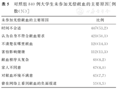 本研究研究组425例大学生参加无偿献血的主要原因为奉献爱心(85.6%,364/425)和检查血型(53.6%,228/425)。对照组840例大学生未参加无偿献血的主要原因为时间不合适(53.2%,447/840)和认为自身不符合献血要求(50.1%,421/840)。2组大学生的是否参与无偿献血的动机,见表4,表5。
