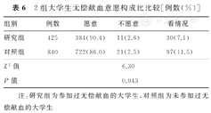 2组大学生无偿献血意愿构成比比较[例数(%)]