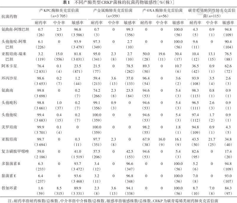 | 抗菌药物 | 产KPC酶肺炎克雷伯菌(n=3 705) | 产金属酶肺炎克雷伯菌(n=359) | 产OXA酶肺炎克雷伯菌(n=56) | 碳青霉烯酶阴性肺炎克雷伯菌(n=115) | ||||||||