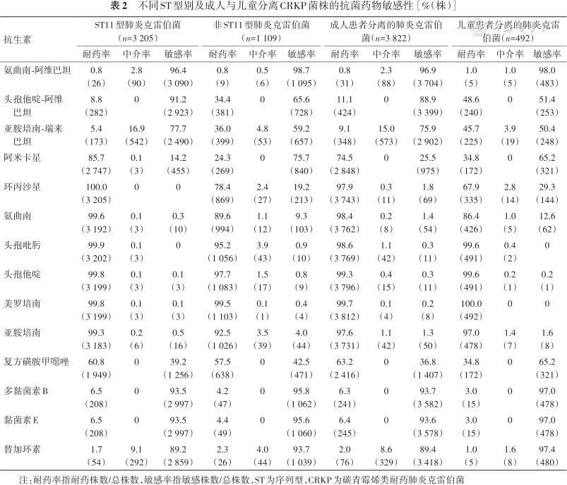 注:耐药率指耐药株数/总株数,敏感率指敏感株数/总株数,ST为序列型,CRKP为碳青霉烯类耐药肺炎克雷伯菌