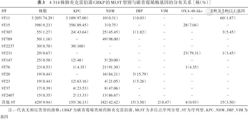 4 314株肺炎克雷伯菌CRKP的MLST型别与碳青霉烯酶基因的分布关系[株(%)]