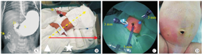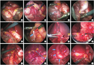 根据异常解剖标志制定程序化手术步骤:①麻醉与体位,患儿气管插管全身麻醉满意后,取仰卧位,身体长轴与手术床长轴呈约30°~45°夹角,脚侧靠近术者,注意保暖,直肠内置入体温监测探头;②建立操作通道并腹腔镜探查,脐左下缘做切口,开放建立气腹后置入5 mm Trocar并固定做镜孔,脐右侧腹直肌外缘及左上腹做切口置入3 mm Trocar并固定做操作孔,直视下操作钳辅助经胃管抽吸胃内气体液体,扩大手术视野,探查腹腔证实肠旋转不良;③复位扭转肠管,找到脾区横结肠,逆行交替上提横结肠,以其为参照物逆扭转方向复位扭转的肠管,直至见到阑尾,证明结肠复位,继续交替上提盲肠及小肠,逆扭转方向复位小肠,见小肠及系膜完整,呈扇状,证明小肠复位;④松解Ladd索带,提起升结肠,电凝钩充分松解与结肠相连的Ladd索带和右侧胃结肠韧带,直至结肠中静脉,将结肠翻向腹腔左侧,松解十二指肠周围的纤维组织,直至将十二指肠变为腹腔内器官,并将十二指肠空肠起始段完全拉直放于脊柱右侧;⑤拓宽系膜根部,沿空肠开始松解挛缩的系膜直至回盲部,直至用丝线测量胰头与阑尾的直线距离>5 cm;⑥充气试验,经胃管于胃内充气,交替挤压胃十二指肠,见空肠快速充气,证实松解充分,消化道通畅;若同时合并环状胰腺、十二指肠隔膜等消化道畸形,同期处理;若有系膜裂孔,则及时用可吸收线缝合修补。(图1、图2)