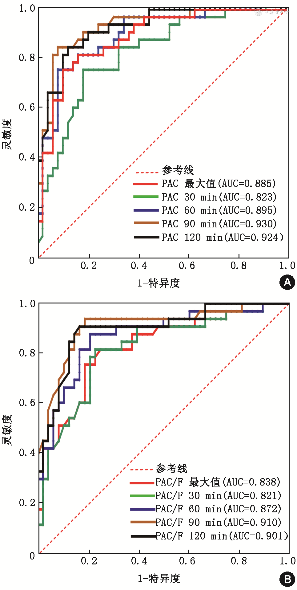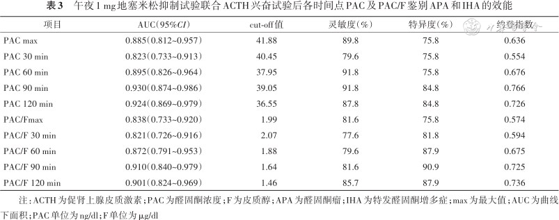 午夜1 mg地塞米松抑制试验联合ACTH兴奋试验后各时间点PAC及PAC/F鉴别APA和IHA的效能