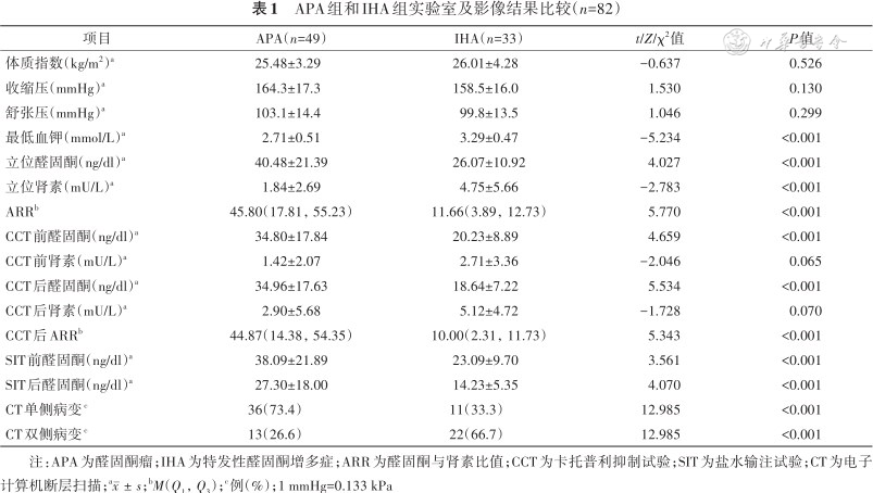 注:APA为醛固酮瘤;IHA为特发性醛固酮增多症;ARR为醛固酮与肾素比值;CCT为卡托普利抑制试验;SIT为盐水输注试验;CT为电子计算机断层扫描;a;bM(Q1,Q3);c例(%);1 mmHg=0.133 kPa