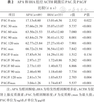 APA和IHA组经ACTH刺激后PAC及PAC/F比较()