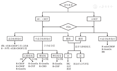 注 CGA:老年综合评估;R-CHOP:利妥昔单抗+环磷酰胺+多柔比星+长春新碱+泼尼松;R-CEOP:利妥昔单抗+环磷酰胺+依托泊苷+长春新碱+泼尼松;R-CDOP:利妥昔单抗+环磷酰胺+脂质体多柔比星+长春新碱+泼尼松;R-CVP:利妥昔单抗+环磷酰胺+长春新碱+泼尼松;R-CHO:利妥昔单抗+环磷酰胺+多柔比星+长春新碱;R-CHP:利妥昔单抗+环磷酰胺+多柔比星+泼尼松;R-GemOx:利妥昔单抗+吉西他滨+奥沙利铂;R-miniCHOP:利妥昔单抗+减剂量的CHOP;BR:利妥昔单抗+苯达莫司汀;IR2:伊布替尼+利妥昔单抗+来那度胺