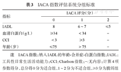 注 IACA指数:纳入IADL的年龄-合并症-白蛋白指数;IADL:工具性日常生活活动能力;CCI:Charlson指数;-:无内容;计算4项参数得分,总分得0分为适合组,1~2分为不适合组,≥3分为脆弱组