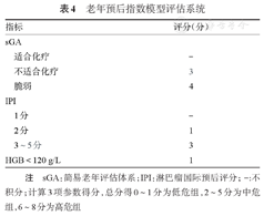 老年DLBCL预后评估建议采用老年预后指数模型,其纳入指标包括:sGA,淋巴瘤国际预后评分(IPI)和HGB,将患者分为低、中、高危,预测3年生存率分别为87%,69%和42%[12],具体评分标准见表4。