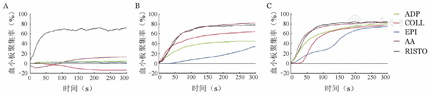 注 ADP:二磷酸腺苷;COLL:胶原;EPI:肾上腺素;AA:花生四烯酸;RISTO:瑞斯托霉素