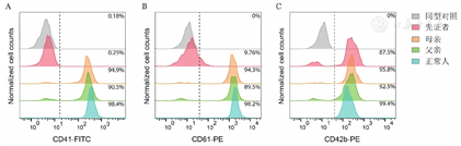 注 A 血小板膜糖蛋白αⅡb(CD41);B 血小板膜糖蛋白β3(CD61);C 血小板膜糖蛋白GPⅠb(CD42b)