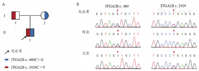 ITGA2B基因第4外显子c.480C>G与第28外显子c.2929C>T的复合杂合突变是本家系遗传性血小板无力症的致病原因。
