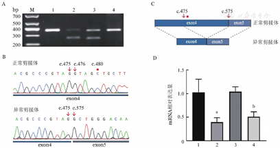 注 A RT-PCR扩增电泳结果(M:DNA Marker;1:正常对照;2:先证者;3:母亲;4:父亲;正常剪接体扩增片段大小为358 bp,异常剪接体扩增片段大小为259 bp)。B 正常及异常剪接体扩增片段Sanger测序结果。C 根据测序结果绘制剪接体示意图,红色正方形指示c.480位点。D qRT-PCR检测mRNA相对水平(1:正常对照;2:先证者;3:母亲;4:父亲。与正常对照比较,aP<0.05)
