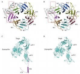 注 A、B 分别为野生型和p.S160-S192缺失型αⅡb亚基β-propeller结构域三维结构模型图(β-propeller结构域包含7个"W"样blade,图中标注为W1~W7;红色虚线方框指示缺失的β链和α螺旋所对应的区域);C、D 分别为野生型和p.R977-E1039缺失的截短型αⅡb亚基完整结构模型图(对结构域进行标注;紫色部位指示CD、TM及calf-2一条β链缺失所对应的区域)