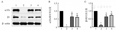 注 A Western blot检测αⅡb、β3蛋白表达(1:正常对照;2:先证者;3:母亲;4:父亲);B、C 分别为灰度值半定量分析血小板总αⅡb、β3蛋白的相对表达量(1:正常对照;2:先证者;3:母亲;4:父亲。与正常对照比较,aP<0.05,bP<0.01,cP<0.001)