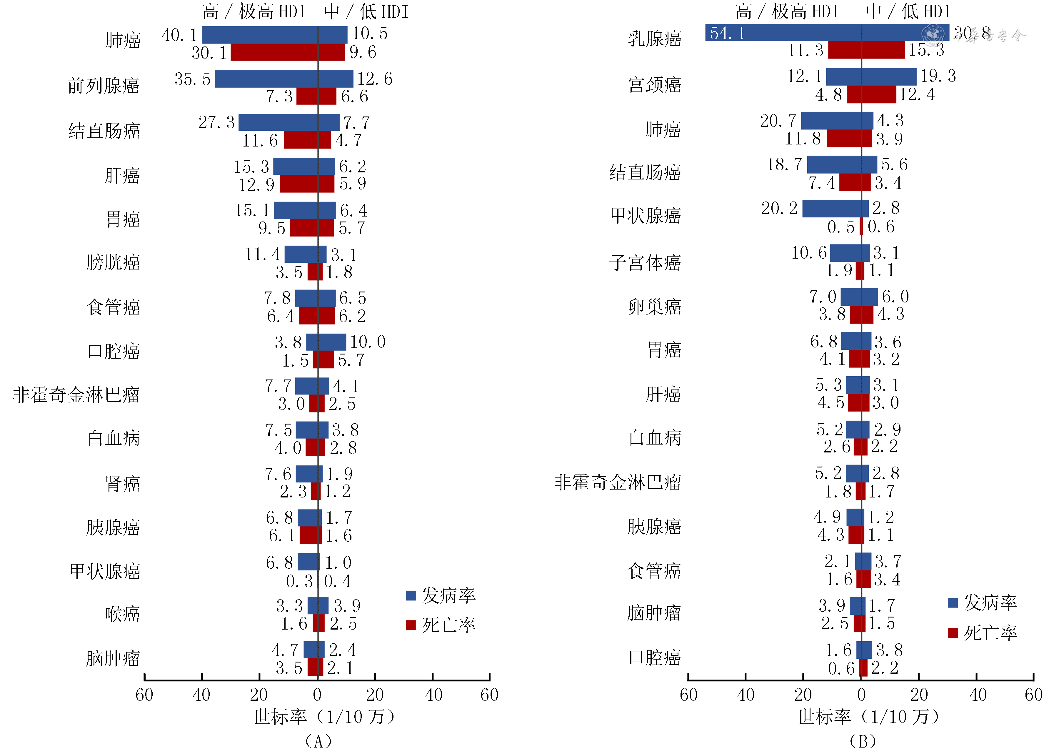 4. 全球主要恶性肿瘤发病和死亡的HDI分布:从全球角度来看,恶性肿瘤发病率随着HDI水平的提高呈上升趋势。在男性中,高/极高HDI地区世标发病率前3位的恶性肿瘤为肺癌(40.1/10万)、前列腺癌(35.5/10万)和结直肠癌(27.3/10万),中/低HDI地区世标发病率前3位为前列腺癌(12.6/10万)、肺癌(10.5/10万)和口腔癌(10.0/10万)。在女性中,无论HDI水平高低,乳腺癌的发病率均远超其他恶性肿瘤。女性第2大高发恶性肿瘤在高/极高HDI地区为肺癌(20.7/10万),在中/低HDI地区为宫颈癌(19.3/10万)。死亡率方面,肺癌在不同HDI地区的男性和高/极高HDI地区的女性中均为恶性肿瘤死因首位,而在中/低HDI地区女性中,乳腺癌(15.3/10万)、宫颈癌(12.4/10万)和卵巢癌(4.3/10万)世标死亡率要高于肺癌(3.9/10万,图1)。在人口密集国家中,特定类型的恶性肿瘤发病负担很大,如中国的肺癌、印度的口腔癌和美国的前列腺癌。