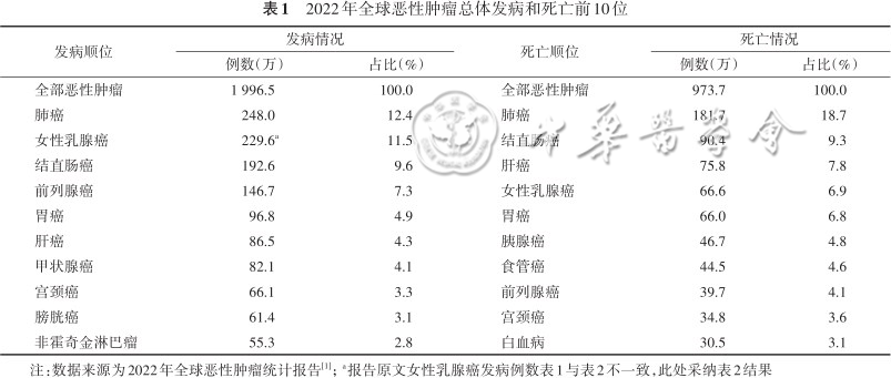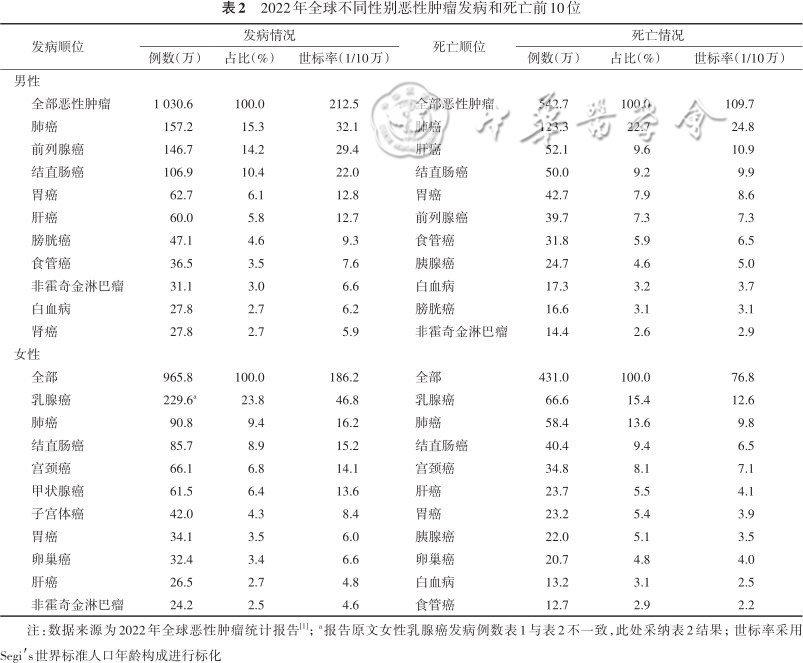 注:数据来源为2022年全球恶性肿瘤统计报告[1];a报告原文女性乳腺癌发病例数表1与表2不一致,此处采纳表2结果