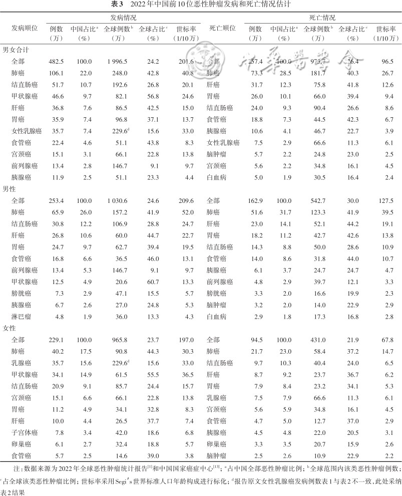5. 中国恶性肿瘤发病和死亡概况:2022年中国恶性肿瘤新发和死亡病例分别占全球恶性肿瘤发病和死亡总数的24.2%(482.5万/1 996.5万)和26.4%(257.4万/973.7万)[13],中国人口约占全球总人口的18.3%[9]。