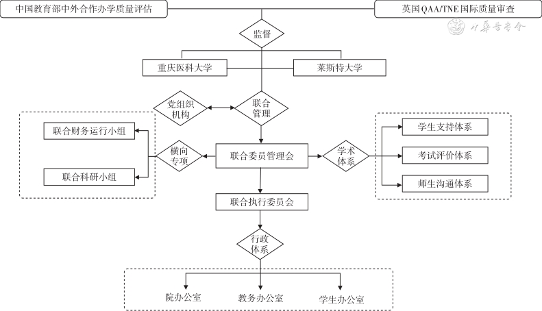 管理体制首先立足顶层设计。QAA在2011年发布《英国高等教育质量准则》,强调学术标准、管理过程与方法和信息公开的目标化,建议高校根据自身经验形成以组织机构为基础,为保障高等教育学术目标提供制度保障的管理系统。QAA在2018年修订的《英国高等教育质量准则》中,首次将学生体验和学生支持放置在与学术标准目标相同的重要位置[7]。2009颁布的中外合作办学评估体办法,对机构和项目的组织管理建立明确的指标,强调从“组织、人、财、物”4大管理内容上建立一整套科学完善有效的管理体系[8]。办学项目通过2个联合委员会,2个联合小组,3个学术保障支持体系作为桥梁,首先将中、外方院校的机构、学术管理组织结构按照各自高校的运行体系要求进行匹配,构架示意图见图1。在管理架构建立后,联合委员会和联合小组从自身工作实际出发,分别从教学管理、学生管理、财务管理、科研管理等方面制定并定期更新其管理目标和功能相应的规章制度。第三,通过3个学术保障支持体系,实施学生评教、专家评估、管理理责、外部监督的“四维一体”的教学质量评估和反馈,形成PDCA闭环,促进人才培养质量提升。2023年5月,办学项目接受了以英国国际高等教育实践准则为指导,由莱斯特大学牵头,英国第三方大学参与的国际质量审查。在2023年11月的联合管理委员会上,两校共同通过了以审查报告为基础形成的16条行动改革方案(Leicester-CQMU Programme Refinement Action Plan),并从12月开始由联合执行委员会推进实施。总的来说,办学项目通过党组织政治监督与联合管理决策交叉集成,行政纵向治理体系与学术横向支撑体系联合闭环,在国内国外质量评估审查双管齐下的指导下,实现了两校管理与学术团队的深度融合,为培养高质量的合作办学项目提供了保障。正如中期国际质量审查报告中所说的,本合作办学项目“为学生提供的支持、服务和资源值得称赞,这也得到了学生的正向反馈。专家组对两校保障学生健康和福祉的方法印象特别深刻”。这也体现了英国高等教育质量保障以学生为中心的发展趋势。