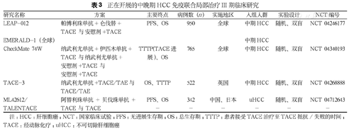而更多联合治疗模式的研究设计是针对中期和晚期HCC患者。最近一项随机、双盲、安慰剂对照、多中心Ⅲ期EMERALD-1研究以既往未接受过TACE或系统治疗的HCC患者为研究对象,评估了在接受传统TACE或经动脉药物洗脱微球化疗栓塞术(DEB-TACE)联合"度伐利尤单抗±贝伐珠单抗"治疗后的疗效和安全性[47]。研究纳入了近60%的中期HCC患者(BCLC B期)以及15%左右的晚期HCC(BCLC C期)患者。研究共616例患者随机均分为3组:1组为TACE+度伐利尤单抗,最后一次TACE后给予度伐利尤单抗+安慰剂;2组为TACE+度伐利尤单抗,最后一次TACE后给予度伐利尤单抗+贝伐珠单抗;3组为TACE+安慰剂,最后一次TACE后给予安慰剂+安慰剂。研究结果显示,与单用TACE相比,度伐利尤单抗+TACE+贝伐珠单抗的PFS明显提高(15.0个月与8.2个月;HR = 0.77,P < 0.05),而度伐利尤单抗+TACE的mPFS相比单用TACE并无显著性提高(10.0个月与8.2个月;HR = 0.94,P = 0.638)。三联方案具有协同增效作用,在生存获益上更具优势,这也为临床治疗选择和未来探索带来启示。目前,针对中晚期HCC还有几项国际多中心随机对照的III期研究正在进行,如"可乐"+TACE(LEAP 012)、纳武利尤单抗+伊匹木单抗+TACE(CheckMate 74W)以及阿"T+A"+TACE(ML42612/TALENTACE)(表3)。期望这些结果的公布能为中晚期HCC的治疗带来新的选择。尽管如此,局部治疗联合系统治疗的模式仍需要不断探索和规范。