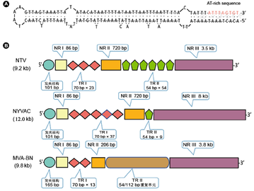 注:A:复制缺陷型痘苗病毒天坛株(NTV)的发夹结构始于序列中第一个错配残基"T"的位置;B:3株复制缺陷型痘苗病毒倒置末端重复序列(ITR)精细结构。NYVAC:复制缺陷型哥本哈根株;MVA-BN:第三代天花病毒疫苗改良安卡拉株