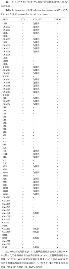 注:ORFs:开放阅读框;NTV:复制缺陷型痘苗病毒天坛株;MVA-BN:第三代天花病毒疫苗改良安卡拉株;NYVAC:复制缺陷型哥本哈根株;"-"代表此ORF在野生株基础上缺失;"+"代表此ORF在对应的复制缺陷型毒株中可编码蛋白;"/"代表此ORF在野生株中不存在;"伪基因"代表此ORF被认定为失活