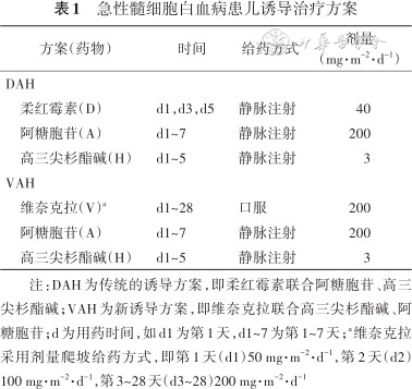 注:DAH为传统的诱导方案,即柔红霉素联合阿糖胞苷、高三尖杉酯碱;VAH为新诱导方案,即维奈克拉联合高三尖杉酯碱、阿糖胞苷;d为用药时间,如d1为第1天,d1~7为第1~7天;a维奈克拉采用剂量爬坡给药方式,即第1天(d1)50 mg·m-2·d-1,第2天(d2)100 mg·m-2·d-1,第3~28天(d3~28)200 mg·m-2·d-1