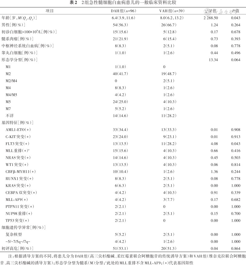 共纳入135例患儿,DAH组96例,男54例,女42例,年龄6.4(3.9,11.6)岁;VAH组39例,男26例,女13例,年龄8.0(6.2,13.2)岁。135例患儿中,最常见的形态类型为髓系(myloid,M)2和M5,分别有59和28例;融合基因或突变基因以AML1-ETO最为常见,其次是C-KIT突变、FLT3突变、MLL重排(除外MLL-AF9)、NRAS突变、WT1突变,分别有46、32、24、19、18和17例。2组患者的临床资料详见表2。VAH组患儿的年龄大于DAH组,FLT3突变患者比例高于DAH组(均P=0.043),2组患儿其他基线特征差异无统计学意义(均P>0.05)。