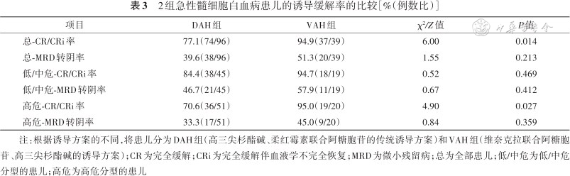 2.危险度分层后患儿缓解率比较:进一步比较不同危险度患者两组诱导方案治疗后的骨髓CR/CRi率和MRD转阴率。在初诊为低/中危的患儿中,DAH组和VAH组的CR/CRi率(P=0.469)和MRD转阴率(P=0.412)差异无统计学意义;在初诊为高危的患儿中,VAH组的CR/CRi率高于DAH组(P=0.027),但2组间MRD转阴率差异无统计学意义(P=0.359,表3)。