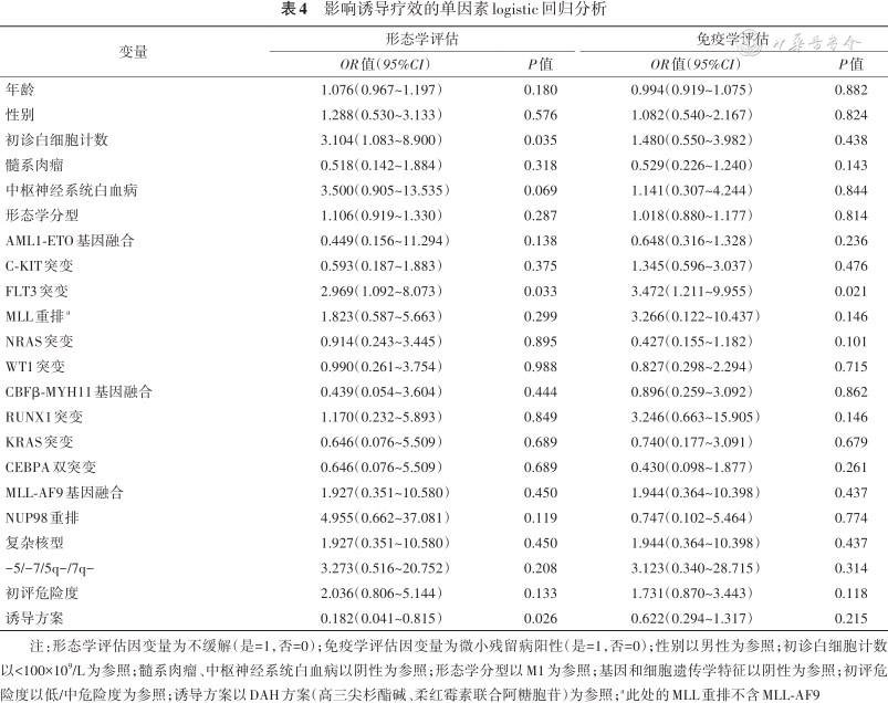 1.单因素分析:初诊白细胞计数、FLT3突变、诱导方案是形态学不缓解的影响因素(均P<0.05);FLT3突变是免疫残留不缓解的影响因素(P=0.021,表4)。