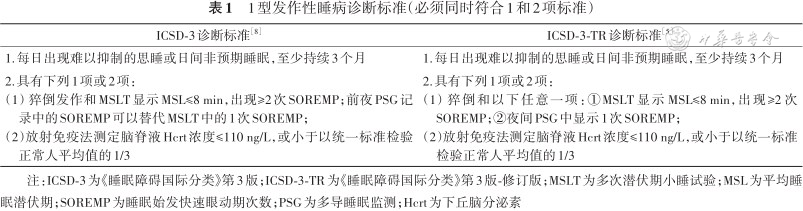注:ICSD-3为《睡眠障碍国际分类》第3版;ICSD-3-TR为《睡眠障碍国际分类》第3版-修订版;MSLT为多次潜伏期小睡试验;MSL为平均睡眠潜伏期;SOREMP为睡眠始发快速眼动期次数;PSG为多导睡眠监测;Hcrt为下丘脑分泌素