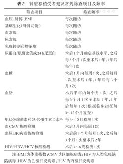 受者每次就诊时推荐常规进行血常规、尿常规、基础生物化学检测(肝肾功能)及免疫抑制剂药物(包括他克莫司、环孢素A、西罗莫司、依维莫司)浓度检测,尿蛋白阳性者行尿白蛋白/肌酐比值或24 h尿蛋白检测[3]。此外定期行移植肾脏超声检查,并监测心功能、内分泌与代谢疾病(包括糖代谢、脂代谢、骨代谢等)及病毒感染情况[包括BK病毒、巨细胞病毒(cytomegalovirus ,CMV)、EB病毒、JC病毒、乙型肝炎病毒(hepatitis B virus,HBV )、丙型肝炎病毒(hepatitis C virus ,HCV)等],条件具备时尽量在术后早期动态监测淋巴细胞亚群检测、免疫球蛋白系列检测等免疫指标,必要时行群体反应性抗体(panel reactive antibody ,PRA )、供体特异性抗体(donor-specific antibody ,DSA)检测和移植肾脏穿刺活检等检查。远期受者还应行肿瘤筛查,包括影像学检查(甲状腺、腹部、泌尿系超声或胸腹部CT等)、肿瘤标志物检查(如癌胚抗原和甲胎蛋白)等特殊项目检查。应根据性别不同进行相应的跟踪检查,女性需进行乳腺和妇科检查,男性需进行前列腺特异性抗原检测[3]。常规推荐检查项目及频率见表2。