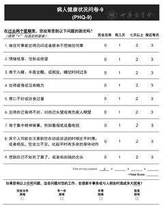 抑郁症筛查量表9项(patient health questionnaire-9,PHQ-9)是一种简洁有效的抑郁自评问卷,2001年由Kroenke等[86]根据抑郁发作诊断标准编制而成(图1)。国内外研究已证实其具有良好的信度和效度,常被推荐作为患者抑郁筛查工具。该问卷总分范围为0~27分,总分在0~ 4分为无抑郁症状,5~ 9分为轻度抑郁,10~ 14分为中度抑郁,15分以上为重度抑郁;得分越高,筛查为抑郁障碍可能性越大[87]。