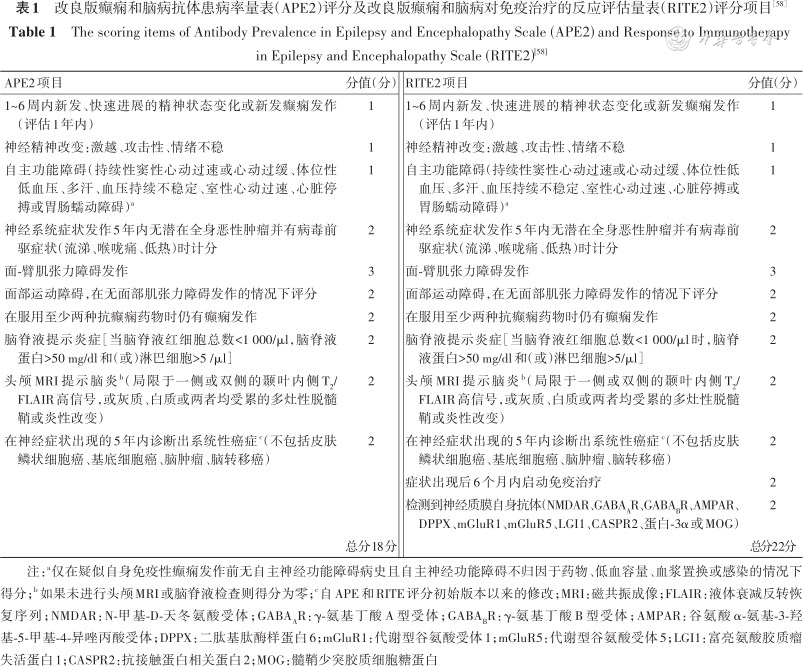 改良版癫痫和脑病抗体患病率量表(APE2)评分及改良版癫痫和脑病对免疫治疗的反应评估量表(RITE2)评分项目[58]
