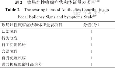 为了便于尽早诊断并开始免疫治疗AE,改良版癫痫和脑病抗体患病率量表(Antibody Prevalence in Epilepsy and Encephalopathy,APE2)用于在获得抗体测试结果之前预测自身免疫抗体阳性的可能性[57]。当APE2评分≥4分时,预测自身免疫抗体阳性的可能性最高[58]。同时,Dubey等[58]依据接受免疫治疗患者的临床特点提出改良版癫痫和脑病对免疫治疗的反应评估量表(Response to Immunotherapy in Epilepsy and Encephalopathy Scale,RITE2),RITE2评分≥7分预测良好癫痫发作结局的可能性较高。APE2和RITE2评分对AE,尤其是NORSE患者病因的诊断和免疫疗效有较良好的预测作用(表1)。对于无明显脑炎的局灶性癫痫患者,致局灶性癫痫症状和体征量表(Antibodies Contributing to Focal Epilepsy Signs and Symptoms Scale,ACES)得分≥2分时可能更敏感(表2)[59]。所有病因不明且APE2评分≥4分的癫痫患者都应接受自身免疫性抗体评估。若经临床验证与AE相关的自身免疫性抗体为阳性,则该病例符合“明确的AE”的标准;对于自身免疫性抗体为阴性且APE2评分≥4分的患者,可行外周血和脑脊液的基于组织底物的实验(tissue-based assay)检测,寻找潜在的未知抗体,并尽量保存起病最初的血清和脑脊液样本以备必要时复检,同时应考虑进行免疫诊断治疗。对免疫治疗试验反应良好或APE2评分≥7分的患者(无论免疫治疗试验的结果如何)都支持“可能的AE”的诊断。合理应用APE2、RITE2及ACES评分有助于更准确地诊断以及降低诊断成本。