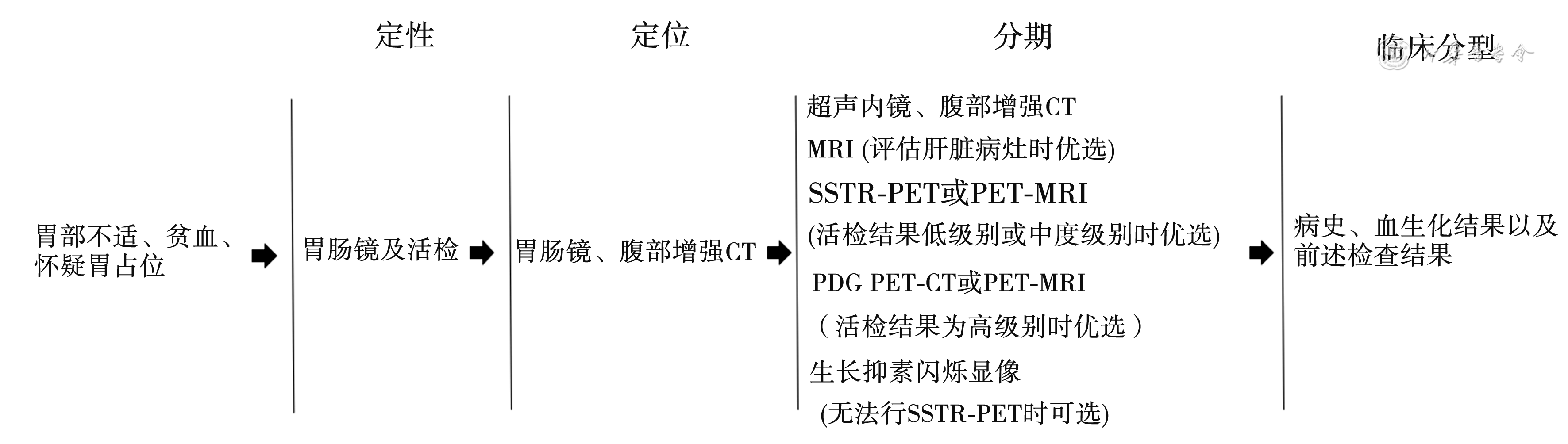 注:EGD:食管胃十二指肠镜;EUS:超声内镜;CT:计算机断层扫描;MRI:磁共振成像;SSTR:生长抑素受体;PET:正电子发射断层成像;SPECT:单光子发射型计算机断层成像;FDG:脱氧葡萄糖