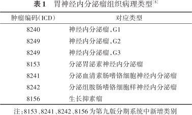 NEN可以发生在不同器官,既往针对不同器官所划分的NEN组织分型差异很大,不利于病理学家和临床医生交流和管理。胃NET第九版分期系统的组织病理类型依据第五版世界卫生组织病理学分类分级标准进行了更新[7]。除了继续保留依据分化程度、核分裂像和Ki-67指数进行 G1、G2和G3的分类外,第九版分期系统还依据细胞起源,将能够分泌激素的功能性NET列举更新到胃NET的组织病理学分类中,包括分泌胃泌素(G-cell)NET、分泌血清素肠嗜铬细胞(EC-cell)NET、分泌组胺肠嗜铬细胞样(ECL-cell)NET以及未指定分类的生长抑素瘤(也称D细胞NET)。但是大部分的胃NET并没有分泌相关的症状,且属于分泌组胺嗜铬细胞样NET[8]。见表1。