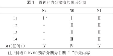 第九版分期系统对胃NET的预后分期进行了修订,结构更加清晰,见表4。临床实践中,胃NET很少出现胃周淋巴结转移且预后良好,大部分患者行内镜治疗,未获取胃周淋巴结数据。因此,这部分患者的分期多数为T1NxM0[27, 28, 29]。但是第八版分期手册中并未提及T1NxM0胃NET的预后分期分类。美国国家癌症中心统计数据研究表明,T1NxM0和T1N0M0分期胃NET患者的远期预后差异无统计学意义[23,30]。鉴于此,第九版分期系统将T1NxM0胃NET的预后分期分类为Ⅰ期,完善了胃NET内镜治疗后的预后分期分类。但是新版胃NET分期系统并未提及原位癌(Tis)预后分期,以及也并未按照cTNM分期、pTNM分期和ypTNM分期分别推荐并制定预后分期。
