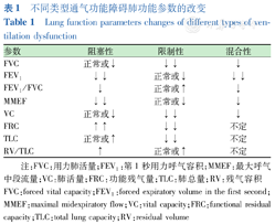 推荐依据:通气功能障碍分为阻塞性、限制性和混合性3种类型。阻塞性通气功能障碍是由于气道阻塞或狭窄导致的气流受限,表现为FEV1、FEV1/FVC、呼气峰流量(peak expiratory flow,PEF)、最大呼气中段流量(maximal midexpiratory flow,MMEF)等的降低。限制性通气功能障碍指肺容量减少、肺扩张受限所引起的通气功能障碍,表现为肺容量指标的下降,如TLC、肺活量(vital capacity,VC)、FVC、功能残气量(functional residual capacity,FRC)等,伴或不伴气体流量下降。混合性通气功能障碍则指兼有阻塞性和限制性两种表现,表现为FEV1、FEV1/FVC及TLC、VC、FVC等的下降。