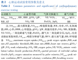 注:VO2max:最大摄氧量;VO2peak:峰值摄氧量;WR:功率;AT:无氧阈值;HR:心率;HRR:心率储备;ΔVO2/ΔW:氧做功效率;VO2/HR:氧脉搏;VE/VCO2:二氧化碳通气当量;PetCO2:潮气末二氧化碳分压;SpO2:经皮动脉血氧饱和度;VEpeak:峰值分钟通气量;MVV:最大通气量;BR:呼吸储备 VO2max:maximum oxygen uptake;VO2peak:peak oxygen uptake;WR:watt rate;AT:anaerobic threshold;HR:heat rate;HRR:heart rate reserve;ΔVO2/ΔW:VO2-work relationship;VO2/HR:oxygen pulse;VE/VCO2:minute ventilation/carbon dioxide production;PetCO2:partial pressure of end-tidal carbon dioxide;SpO2:oxygen saturation measured by pulse oximetry;VEpeak:peak minute ventilation;MVV:maximal voluntary ventilation;BR:breathing reserve