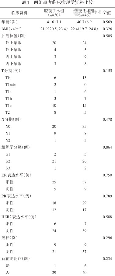 | 临床资料 | 腔镜手术组(n=30) | 传统手术组(n=46) | P值 |