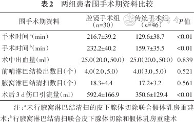 | 围手术期资料 | 腔镜手术组 (n=30) | 传统手术组(n=46) | P值 |